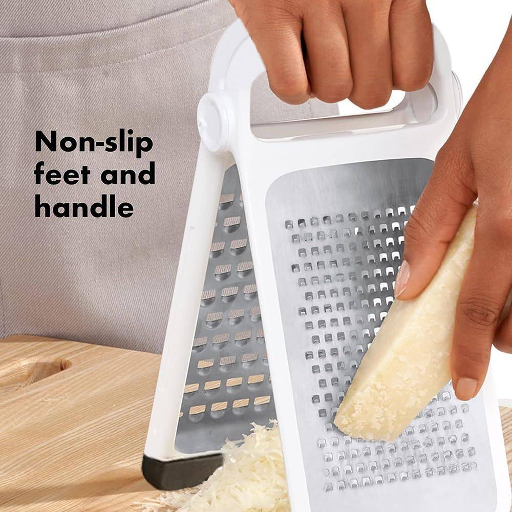 After our old box grater wore out, we stumbled upon this foldable grater. Its performance is outstanding, effectively handling both hard and soft food items. The sharp, precise grating planes remind me of other high-quality kitchen tools I've owned. Its detachable design makes cleaning straightforward. I usually use just one side over a bowl, which is very convenient