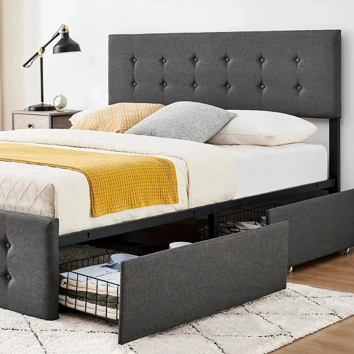 This bed frame is a standout. The storage drawers are incredibly useful, and the bed is both sturdy and quiet. The adjustable headboard and modern linen fabric give my bedroom a chic look. Plus, it was easy to put together. I'm very happy with my purchase.
